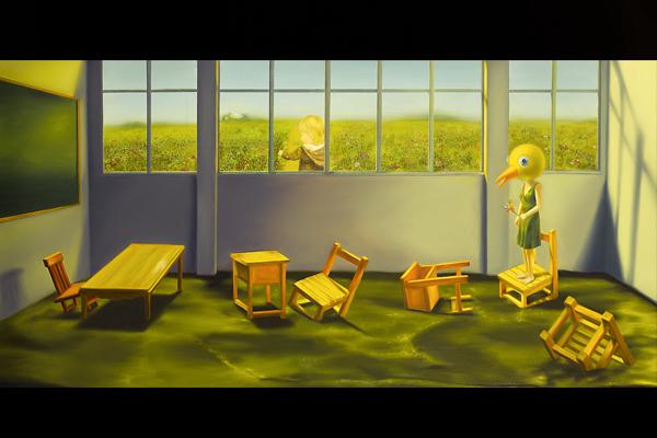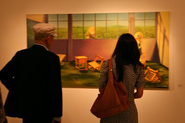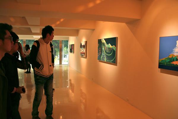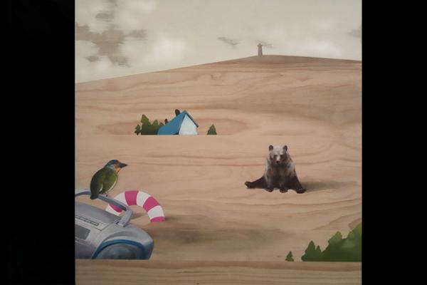 一踏進索卡藝術中心,曾聖惠的木板畫作就映入眼簾。她的作品讓小編聯想到達利(Dali),在抽象的空間裡,真實的物件都變得虛幻、荒蕪。曾聖惠的創作一直都很調皮,充滿了動物和城市生活細節的景色,偶爾還會看到「倒栽蔥」的小丑在角落出現(她說那就像是自己)。車子這類機械式的產物代表著生活節奏的快速,於是讓車子陷於流沙中,那種拖住、拉住、扯住時間流動的心境不言而喻。在聖惠的創作裡,我們可以看到她企圖在自身的生活感知與視覺感知操作中取得平衡。