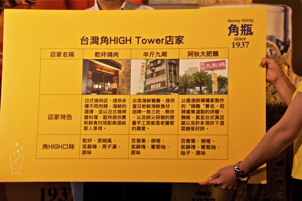 今年夏天,台灣三得利將引進 3 台「角 HIGH Tower」安裝在台北與台中三家合作旗艦餐廳中,讓台灣消費者也能享受風靡日本,超激碳酸、清涼的「角 HIGH」! 暢快的超強碳酸搭配清爽的檸檬香氣,使「角 HIGH」格外適合搭配重口味與煎、炸、燒烤類的料理飲用。因此首次來台灣的 3 台「角 HIGH Tower」,特別選擇了日式燒烤肉與台式海鮮料理店裝設,讓喜歡美食的消費者能夠享受另一番的美食與美酒的盛宴。