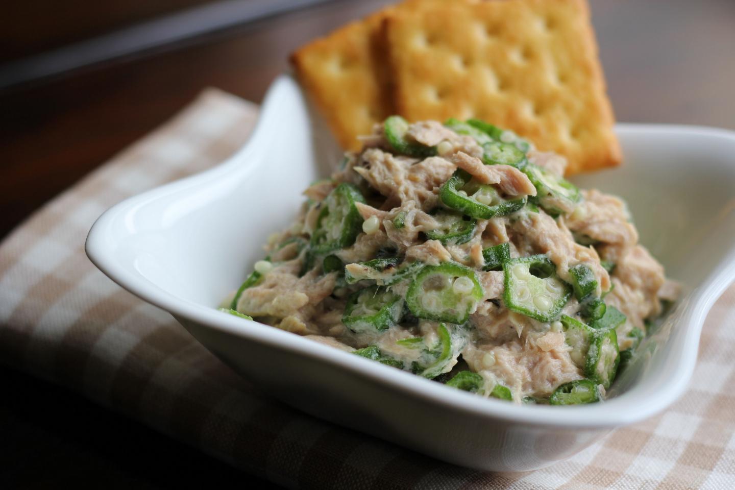 將鮪魚罐頭中的油水瀝乾,倒入碗中,加入秋葵、黃檸檬汁、美乃滋及黑胡椒粉,攪拌均勻,即完成。食用時可搭配餅乾或土司。