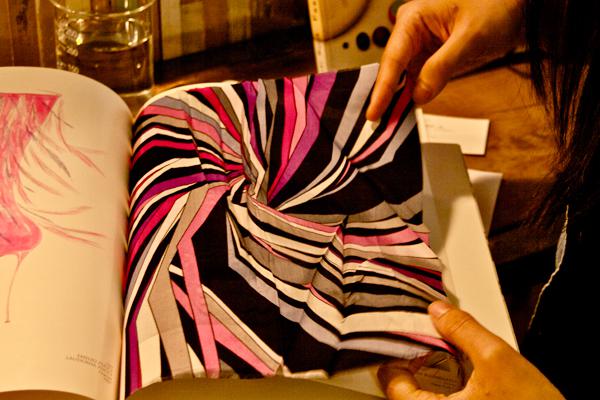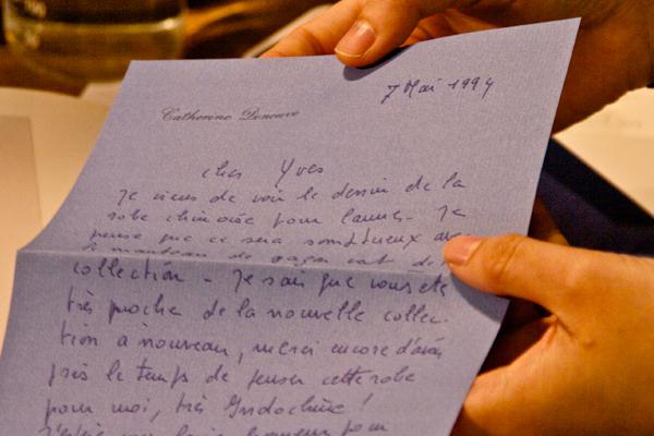 想介紹一本書叫做《Visionaire》,它一年只出三本,很難買到,而且每一本都有一個主題,像我們收集到的這一期是第 22 期,就是以服裝設計師為主題,它的內容都與服裝設計師相關。例如這一頁附上的布料,就真的是那位設計師的作品剪下來的布料,不是複刻的。這封信則是法國第一美女巨星凱瑟琳.丹妮芙(Catherine Deneuve)寫給聖羅蘭先生的一封信,也一併附在書中,非常有趣。