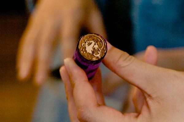 我們之前在「本事」有一個展覽,是「鐵器」展,我們把其他所有的玻璃、鋁的材質撤掉,只剩下金屬。而活版印刷也是用金屬的元素,所以我們就請了楊忠銘老師來上了一堂課。老師上的那堂課的主題是「紙捲印章」,你看喔,這些印章的每一層都是紙,每個人都選出各種不同的紙,再把它捲成印章。每個印章外面裹的花布,都是台灣放了五十年以上的花布,很有紀念價值。這個印章是老師作的,圖樣比較複雜,是生肖,老師上課時還為大家選了一首詩,每個人都刻那首詩裡的一個字,非常浪漫吧!