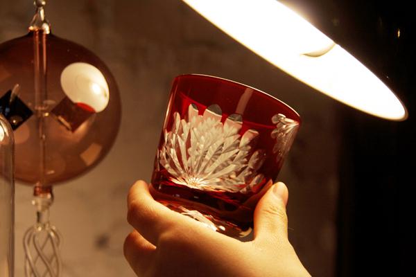 還有這些也是廣田先生的作品,廣田先生告訴我們說,你想看一個玻璃的好壞,將玻璃放在燈光下便是最好的方法。像這一系列細緻的玻璃,其實最早在日本是用來吃蕎麥麵的,非常的講究吧!而這一款紅色的「江戶切子」,製作的師傅都一定是七十歲以上了,師傅一個星期只能做一個,是一種非常困難的夕陽工業技術。