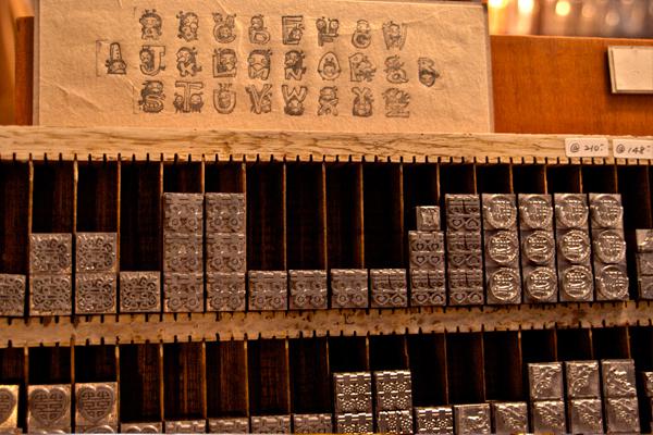 這些鉛字是來自「美好一日工作室」,鉛字在台灣,因為活版印刷技術的關係,已經找不到了。鉛字的好處有兩個,它不像橡皮膠那樣有彈性,所以它不管印了多久,都不會散開,都是很銳利、好看的線條。而且它重量很夠,可以讓字變得更立體。這就是活版印刷看起來有點笨拙、卻很立體、有情感的原因。「美好一日工作室」和「日星鑄字行」合作,引進這些鉛字印章,把這樣美好的傳統藝術介紹給更多人。