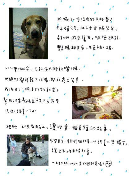 到目前為止,我救過一隻貓、三隻狗,照顧他們醫好病,漂漂亮亮找到新家人。每幫一隻動物,所花費的心力都好大好大(光是跟家裡本來兩隻小狗溝通會有客人,換來的就是一拖拉庫整間屋子的小狗尿),可是當他們找新的爸爸媽媽,被疼惜的樣子,那些辛苦全部都會煙消雲散。所以我把牠印在衣服上,想讓你穿一個幸福的故事,也想告訴更多人,台灣流浪動物的現況,希望一點點一點點的散播出去,可以有更多力量。