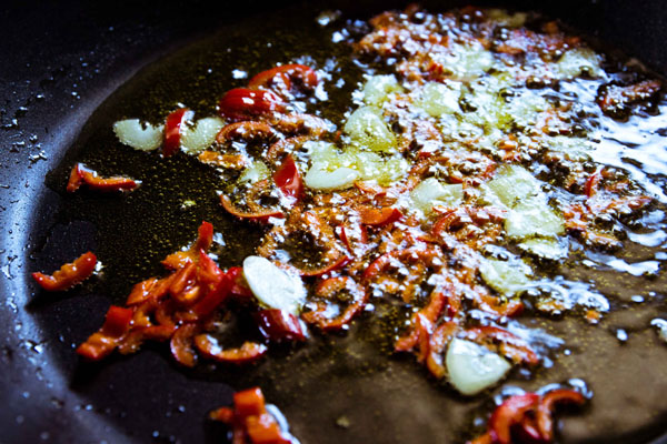 2. 另起一鍋,加橄欖油後用小火加熱,然後放入蒜片,接著加入辣椒(越早加越辣),時間夠的話,還可以事前先把蒜頭和辣椒醃在橄欖油內讓它入味。