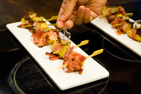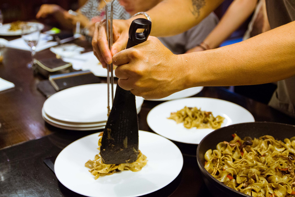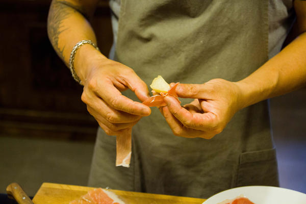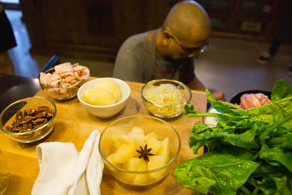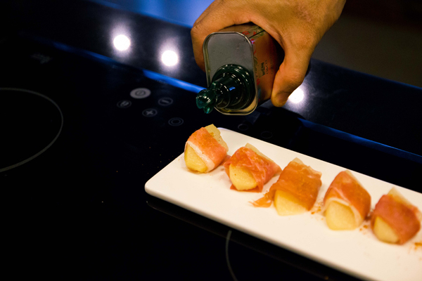 8 月 9 日的第一堂體驗課程「仲夏夜之夢」,由曾經一手打造 Q bar & restaurant 的廚師 Randall,向大家展現他的 Party 好料理,除了現場示範「辛香白酒梨火腿串」、「培根鳳梨番茄乾捲」、「薄荷菠菜黃瓜湯」和「黑橄欖醬蜂蜜胡桃橄欖麵」等創意輕食,也不時分享他個人喜愛的料理小撇步。下著雨的午後,在生活步調總是愜意的天母,親切的型男廚師,展示他的精湛廚藝,人們埋頭品嚐健康美味的料理,這絕對是最讓人心滿意足的夏日行程。
