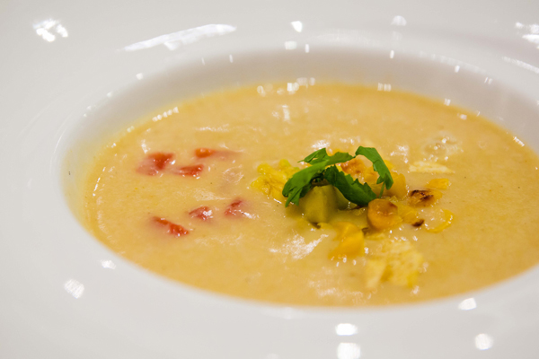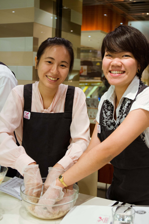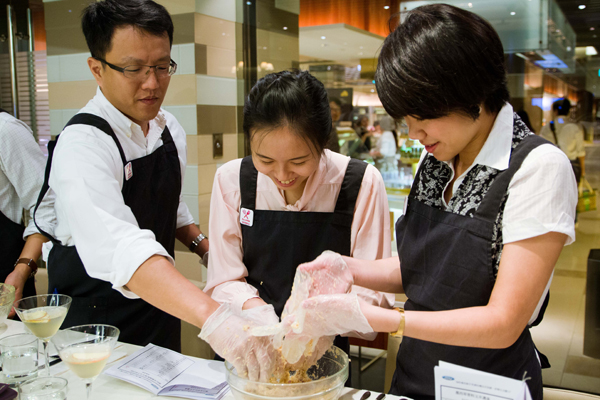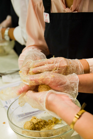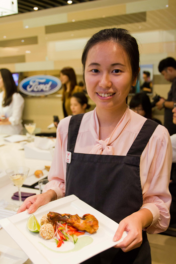 第一道湯品「墨西哥香料玉米濃湯」,濃郁的湯底添加蜜漬番茄乾和酪梨,酪梨的滑順口感與濃湯相得益彰,味覺的尾韻則挾帶了墨西哥香料的辛香,是從未有過的玉米濃湯體驗;接著,事先穿好的圍裙終於派上用場,原來是因為第二道菜餚(唐杜里雞腿配黃豆丸子和沙拉)中的黃豆丸子得自行捏製──黃豆(大豆)在福特汽車產品中,其實也扮演了重要角色,汽車座椅的內層便是由大豆油所製成的大豆發泡材料──喜好動手料理食物的兄弟項與潘美仙著實玩得不亦樂乎,而 Paco 主廚另一方面還示範如何醃製唐杜里雞腿,看得大家口水直流。第三道料理以甜點「法式櫻桃卡拉夫蒂」作結,鵝黃軟嫩的外型令人聯想到汽車座椅那鬆軟舒適的泡棉,溫熱而馥郁的糕體在口中化開,真是幸福得想流淚。