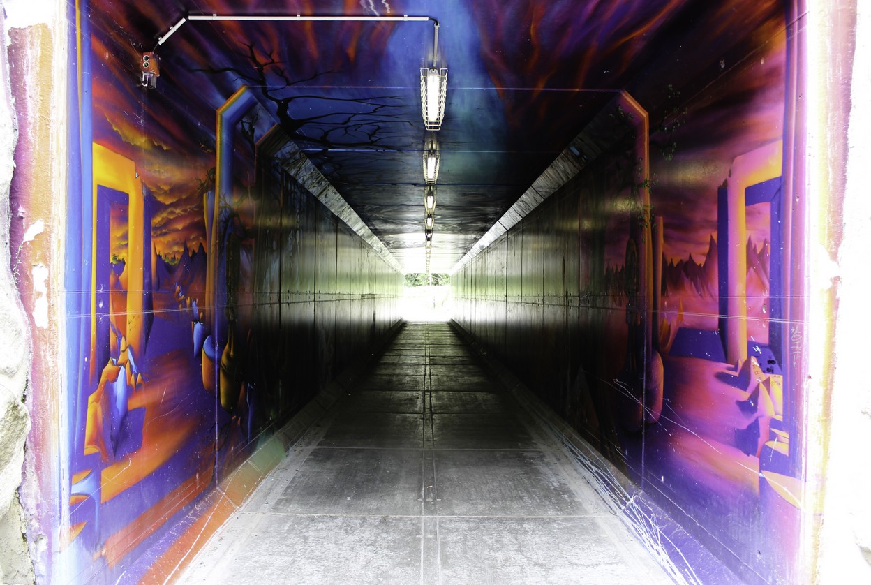 即將走到青年旅館的一個小隧道中,有著無比奇詭的色彩搭配著整個牆面,選山的傳說和故事以一種傳奇的圖案給記錄下來,遑論是登山者的面容或者雪女,遑論是小木屋中的火炬或者外頭被染了色的山峰,整座不到一百公尺的小隧道竟然就成為了一個完整的藝術品。