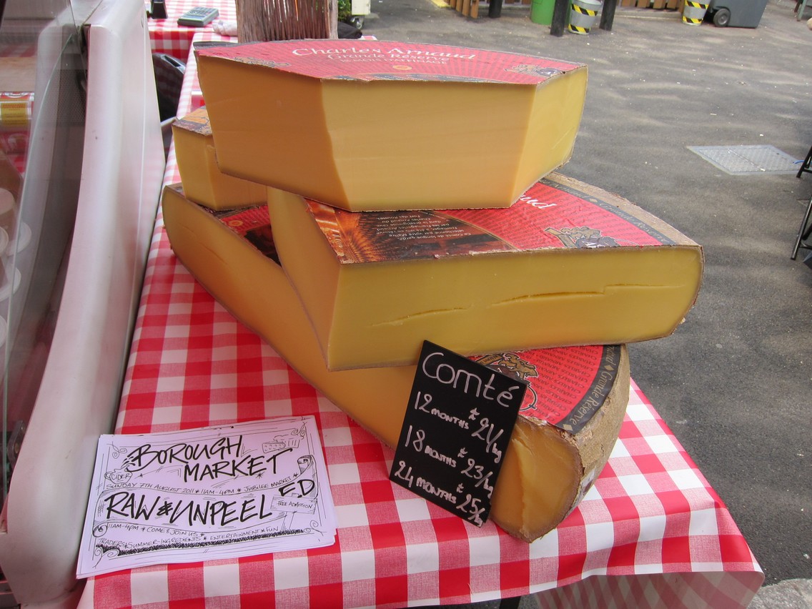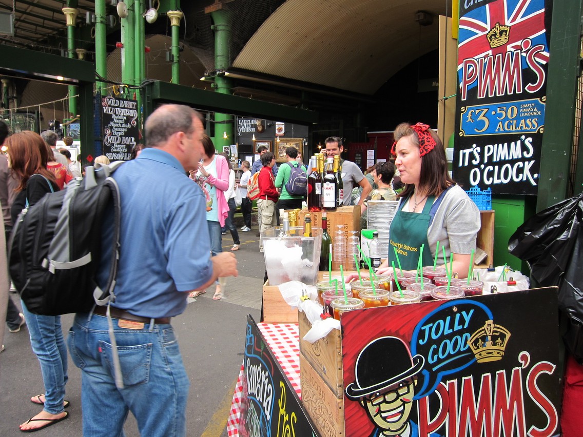 往裡面走,琳瑯滿目的食材跟食物讓我看了眼睛發亮。放眼望去,淺褐色小木桶裝滿了醃紅椒、綠橄欖和黑橄欖,磚色花盆裡竟然是烤得膨鬆香軟的巨大瑪芬,黃澄澄的大塊起司堆疊在紅白格紋的桌布上,透明塑膠杯裡裝著英國人夏天必喝的水果調酒 Pimm’s,彩色的水果方塊飄浮其中……每個攤位都努力經營自己的一方小天地,施展色彩魔法,撇開空氣中瀰漫的美味香氣跟吃下肚的美食不說,Borough Market 本身就是一場視覺的饗宴。