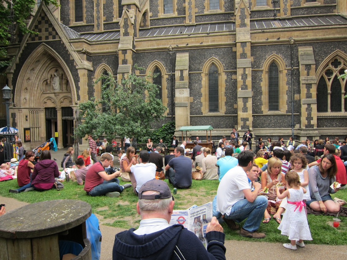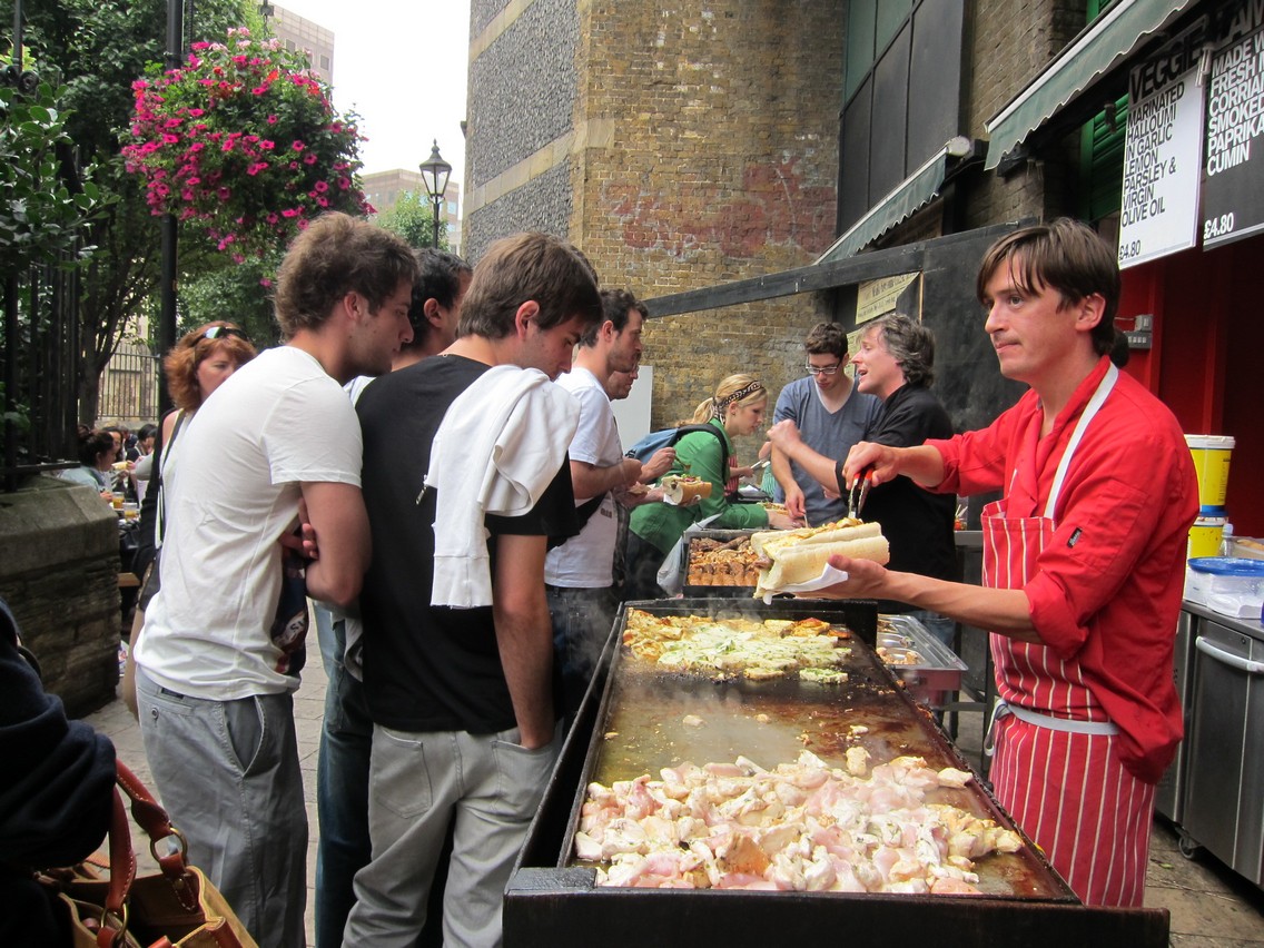 走回生蠔攤,丹尼忙碌依舊,揮揮手跟他道別之後,沿著原路走向進來時的入口。綠色柱子前的三明治攤大排長龍,黑色鐵板冒出陣陣白煙,不管是雞肉羊肉牛肉還是素食口味的希臘起司 Halloumi,全部都在上面翻滾,滋滋作響,夾進切好的法國麵包裡,塞進生菜淋上醬汁就大功告成了。一旁的草地上坐滿了大口啃著三明治的人,歡樂指數跟德國啤酒花園、香港大排檔、台灣夜市不相上下。隨性自在的美味保證帶來難忘的美好時光,Borough Market 一定不會讓你失望!
