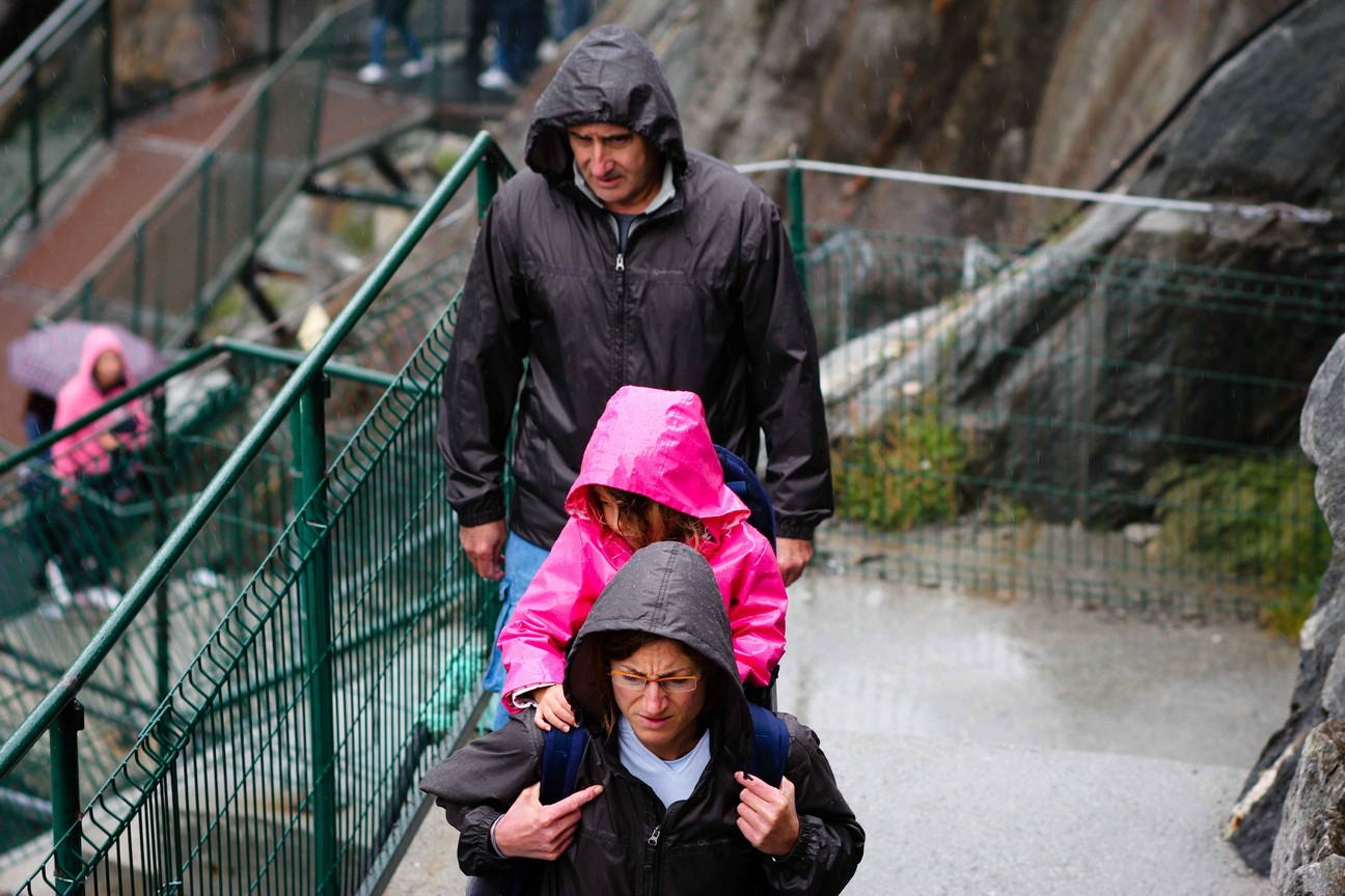 然而這樣的溫暖並沒有持續太久,雨勢突然加劇,我們向上攀爬的腳程並趕不上雨勢的滂沱,雨傘於此也只是心理層面的安慰罷了,我和L只能抓緊身上的衣物硬著頭皮向上,抱持著踩一階是一階的心態前進著,雨並沒有對於不知所以的陌生遊客感到憐憫,越來越大的雨聲在山谷間震盪著,如果有個雨棚和一杯熱咖啡在手,或許我們可以緩下腳步來感受此刻前所未有的感官享受——關於冰河、峽谷、雨勢與回音——然而在現實中我們無暇欣賞這樣的壯美,最後鼠竄到了纜車站,氣喘吁吁地用已經沒有知覺的雙手收起傘,在稍暖一些的纜車包廂裡頭大口吐著氣,濕冷的感覺蔓延全身,腳趾和臉龐一樣的冰冷,雙手凍紫了連握拳都是一種奢侈的手勢,好不容易搭上下山的列車,剛才恍若一夢的過程卻頓時成為這一趟旅程裡頭最美得一段時刻,在向下走了近一小時後走到纜車站的底端時候曾經猶豫起是否要繼續向下走到冰洞去探索,那時候的猶豫現在頓時化成一種慶幸,一種不虛此行的感恩。
