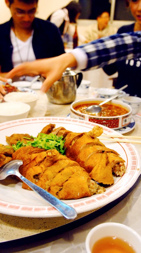 一斤多的鴨子吃到台北變成兩斤多,一路運動,肉質鮮甜富含咬勁。雖然做成燒鴨是首選,但若要享受吃鴨的樂趣,私心最愛的還是八寶鴨,連皮帶肉加骨頭都享受,一點都不浪費。在鴨的肚子裡預先填了爆香過的八寶油飯,吃得到香菇、蝦米、滷肉的香甜。整隻鴨子炸到金黃,然後蒸到化骨,上桌前再炸一趟,吃起來皮酥肉嫩。