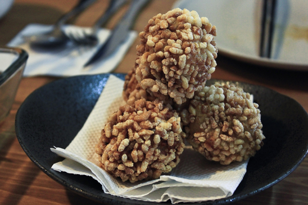 | 以香酥米粒包裹的可樂餅,結合了香脆米果以及鮮美的豬肉。 |