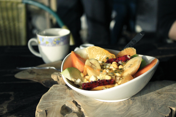 | 4.5 公里咖啡的水果沙拉搭配自製南瓜百香果醬,濃稠酸甜的口味搭香蕉與木瓜特別合拍。 |