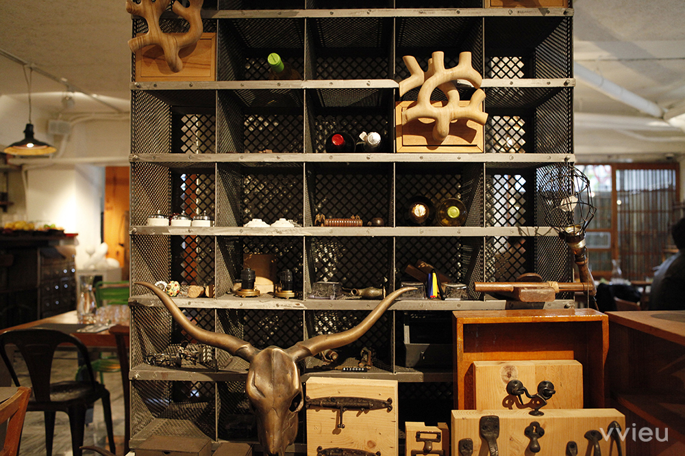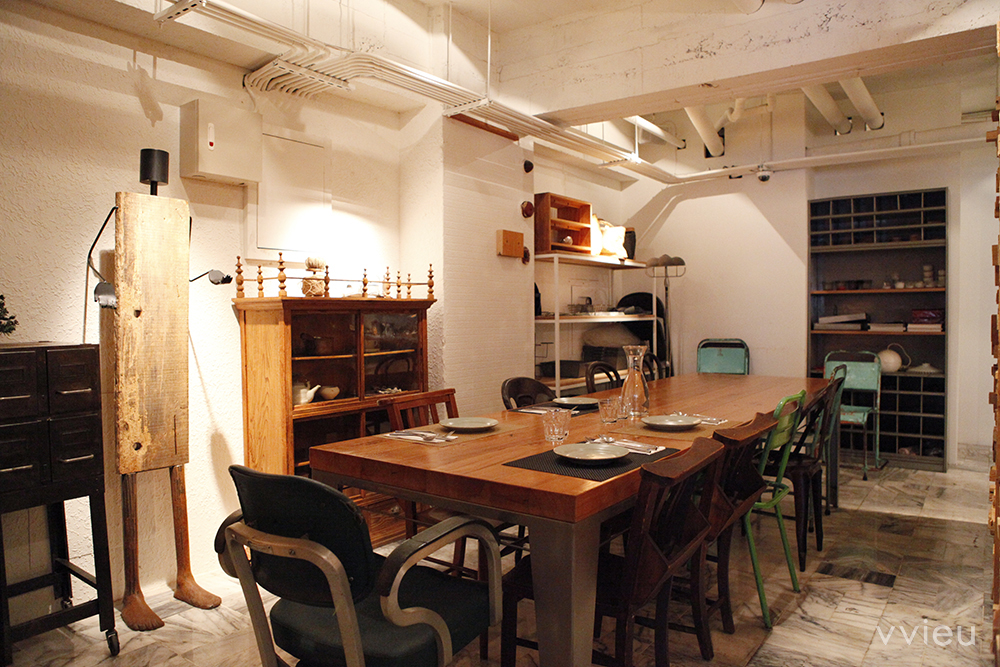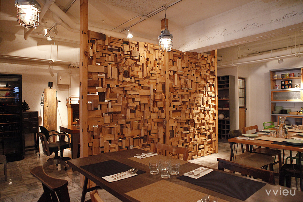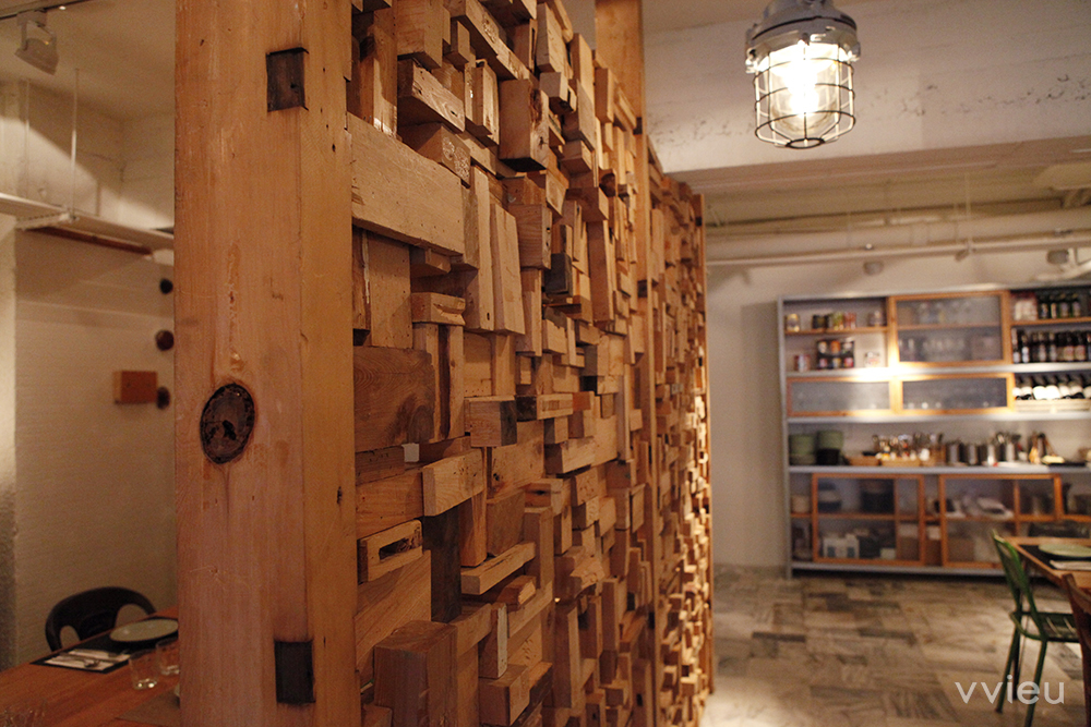 A:店內的木頭全都是選用台灣的老檜木,餐桌的桌面也是找到大片的老檜木訂製而成的,地板則是來自花蓮的大理石,使用的全都是回收材料。傢具則是從世界各地搜羅而來的,我們選用了許多 50、60 年代的單椅作為餐椅,原則上並不特別強調地區,主要是看中年代、材質與做工,回收可再利用的老件。