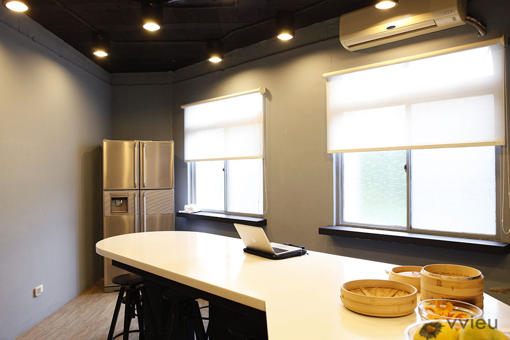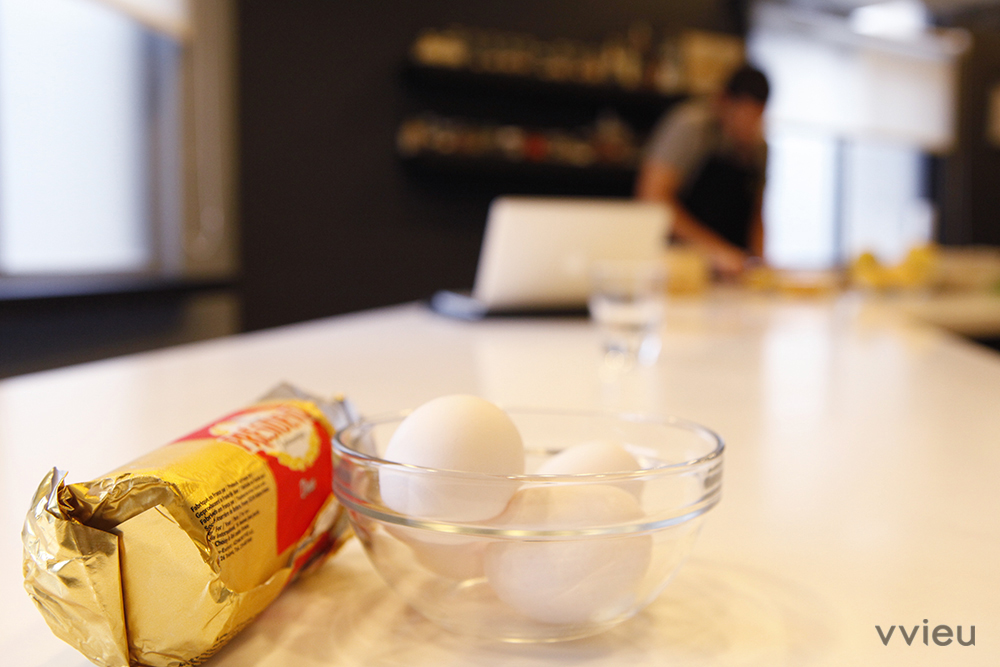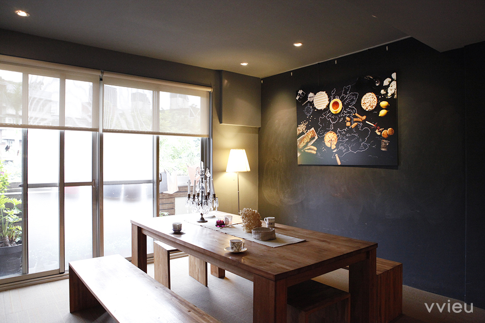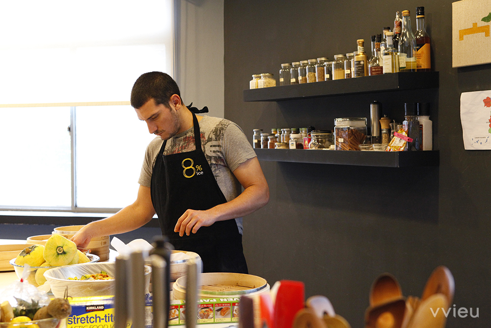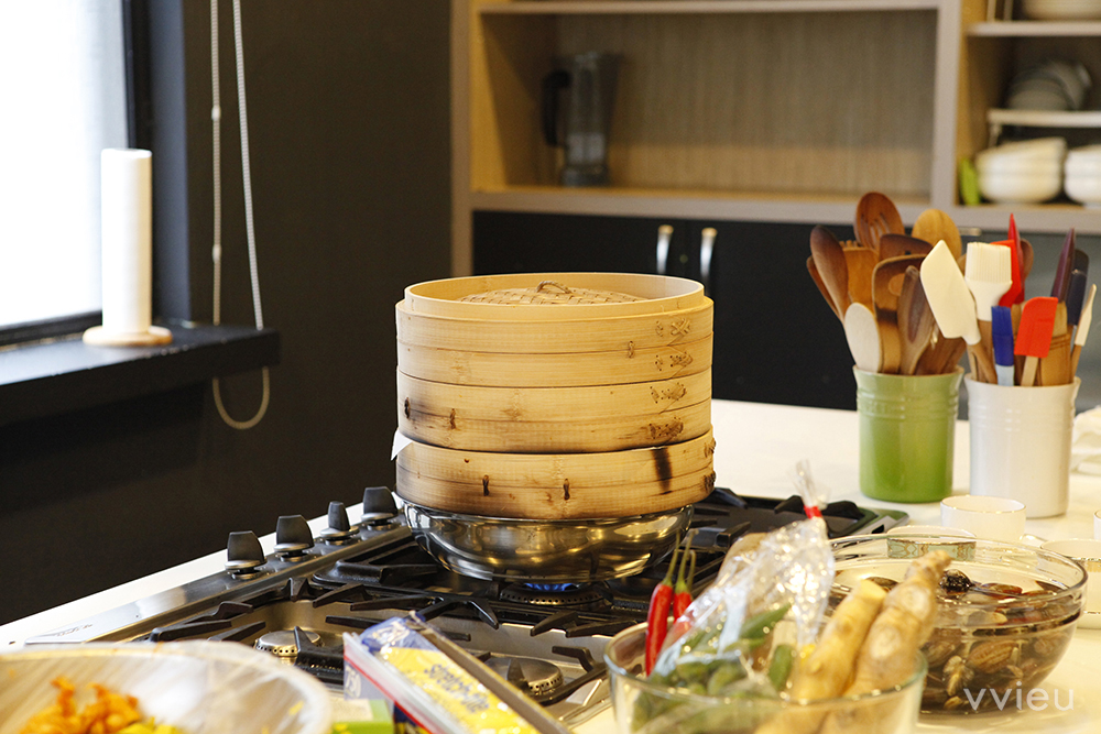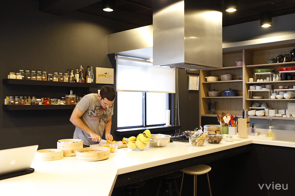 4F Cooking Home 是一間座落於永康街的料理教室,顧名思義,它就在建築的四樓,拜訪當天是個陰天,才一進門,就看見淺淺的光亮從陽台的落地窗灑進 4F Cooking Home 的前廳,環顧四週,書架上有非常多的書籍,當然不外乎都是老版珍藏的食譜書籍,而另一頭也有兩套餐桌椅,提供結束烹飪課的人品嘗自己的成品;緊接著的重頭戲就是烹飪教室了,長型的教室周圍佈滿了整齊的調味罐和器材,環境也非常乾淨整潔,採光也非常明亮清晰,而帥氣的西班牙廚師正在一旁處理南瓜,刀法和和速度都非常利落,一邊和我們聊天一邊工作,沒一下子就整理好並上了蒸籠,解決了一段落。