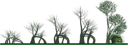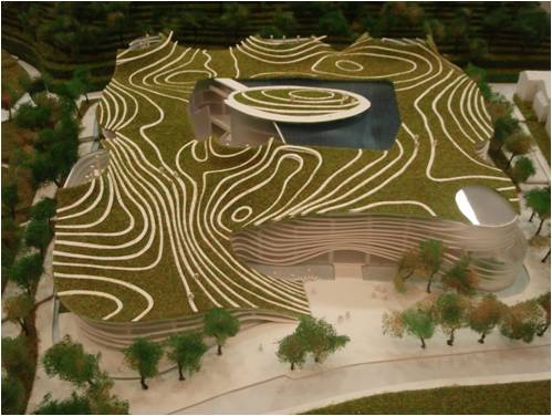 二千多年前,老子《道德經》所言「大音希聲,大象無形」,比喻大道幽顯未現,不可以形體求見,可以用來詮釋綠建築的設計意圖:建築不再自我張顯,而是與環境融合,卻又不失主體性。北投圖書館,與花博三館的呈現,可以說,建築師找到了好的基地,好的空間計劃( program ),好的業主,表現一種獨特的生態美學,自外於房地產的樣板豪宅與主流建築媒體推銷的國際化建築。北投圖書館順應了三角形的基地,有種老子所言「大方無隅」拙樸厚實的美感,功能上,它有固定的使用模式,又因緊鄰日式溫泉博物館,也做為觀光客休憩遊賞的空間;新生三館功能較複雜,兼俱展示、餐飲、休憩、會議等功能。如同建設公司之於接待中心,業主對於花博新生三館如何成為一種「奇觀」( spectacle ),引發媒體效應與社會共鳴,有遠超過使用效能的期待,在這樣的氛圍之下,本應大鳴大放的地標建築,建築師卻巧妙地運用有機形體,將建築「藏」在大自然中,花博新生三館的流動形體,讓未來、生活、與夢想伏匐大地,流於林木花草間,塑造以中庭開放空間為主體的配置,三者形成太極共舞的對話。整體看來,新建三館建築群構成了都市立體公園,市民遊走其上,看飛機起落,如建築師郭英釗所言:建築不再僅是「觀賞式地標」,更成為人群穿梭其間的「體驗式地標」。 「大音希聲,大象無形」之生態美學發展到極致,我們期待九典事務所「中興新村」規劃案的成形(圖7),也可以大膽想像 Mitchell Joachim「種房子」概念的落實(圖8),將自然植栽作為構築房屋空間的機制,自然地景與建築相依共存,成為一種結合生態與美學的有機建築。