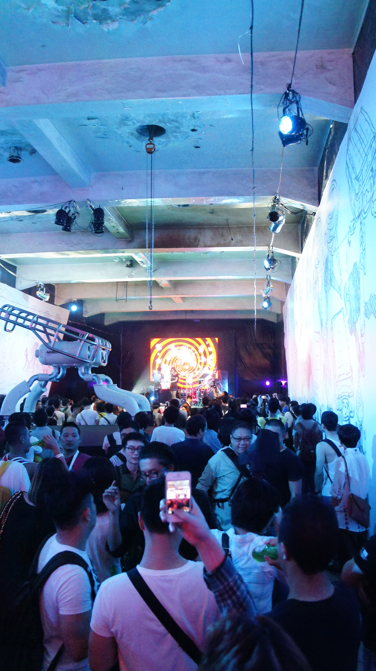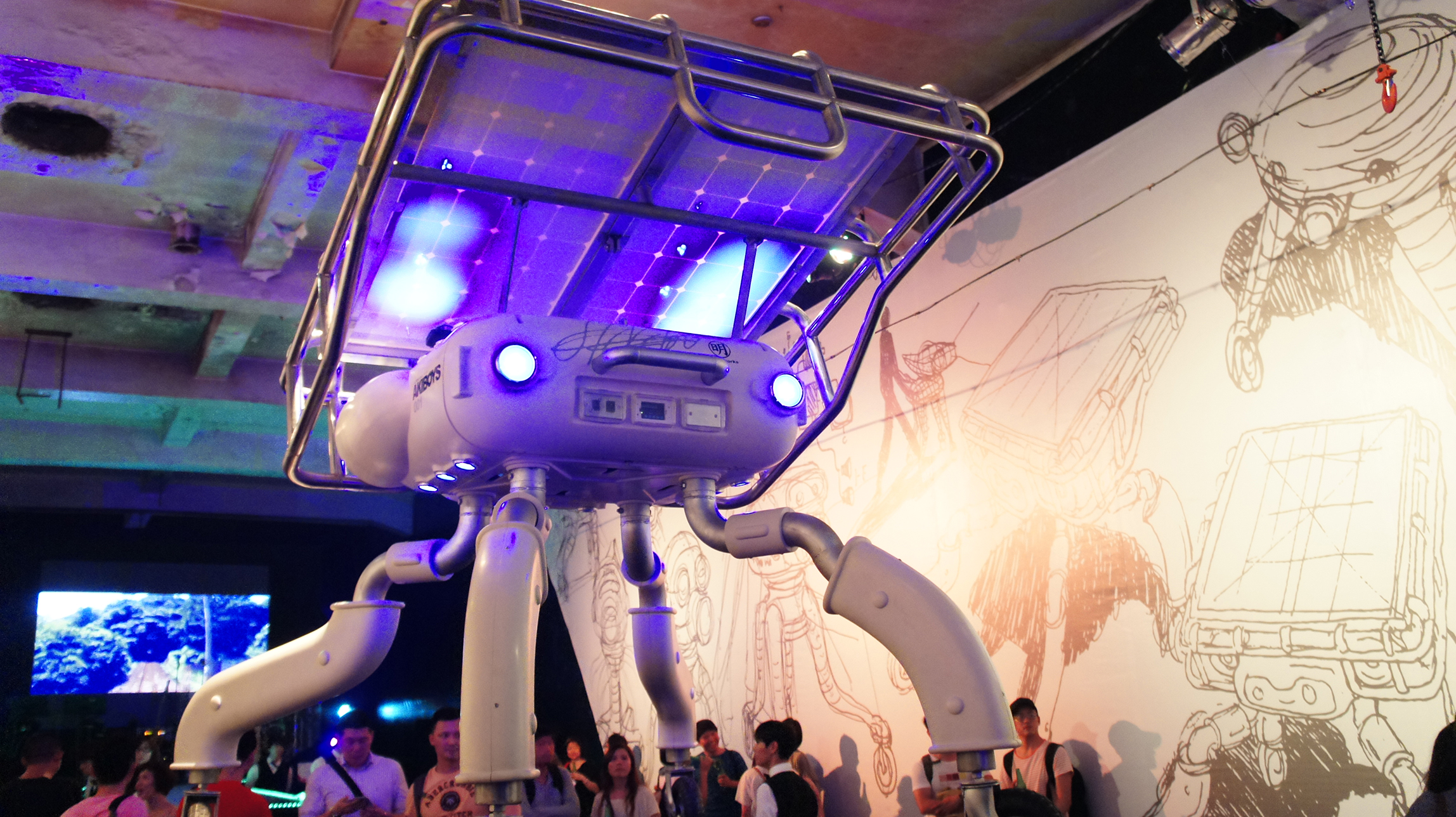 再往裡面走則是一間間的倉庫,展示著攝影、時尚設計、互動影像等不同的裝置藝術。耳朵跟著音樂走,來到了一間非常熱鬧的空間,兩側的舞台分別尬著音樂,觀眾一下左一下右的觀望,中間則是 Akibo 老師的【光虫】不停的跟著音樂閃爍著,探討的是將來在沒有電的世界裡,演唱會是否需要靠自己發電才能享受表演。牆面上滿是手稿和發想過程的筆記,讓參觀者可以一眼看出光虫的零件和構造。