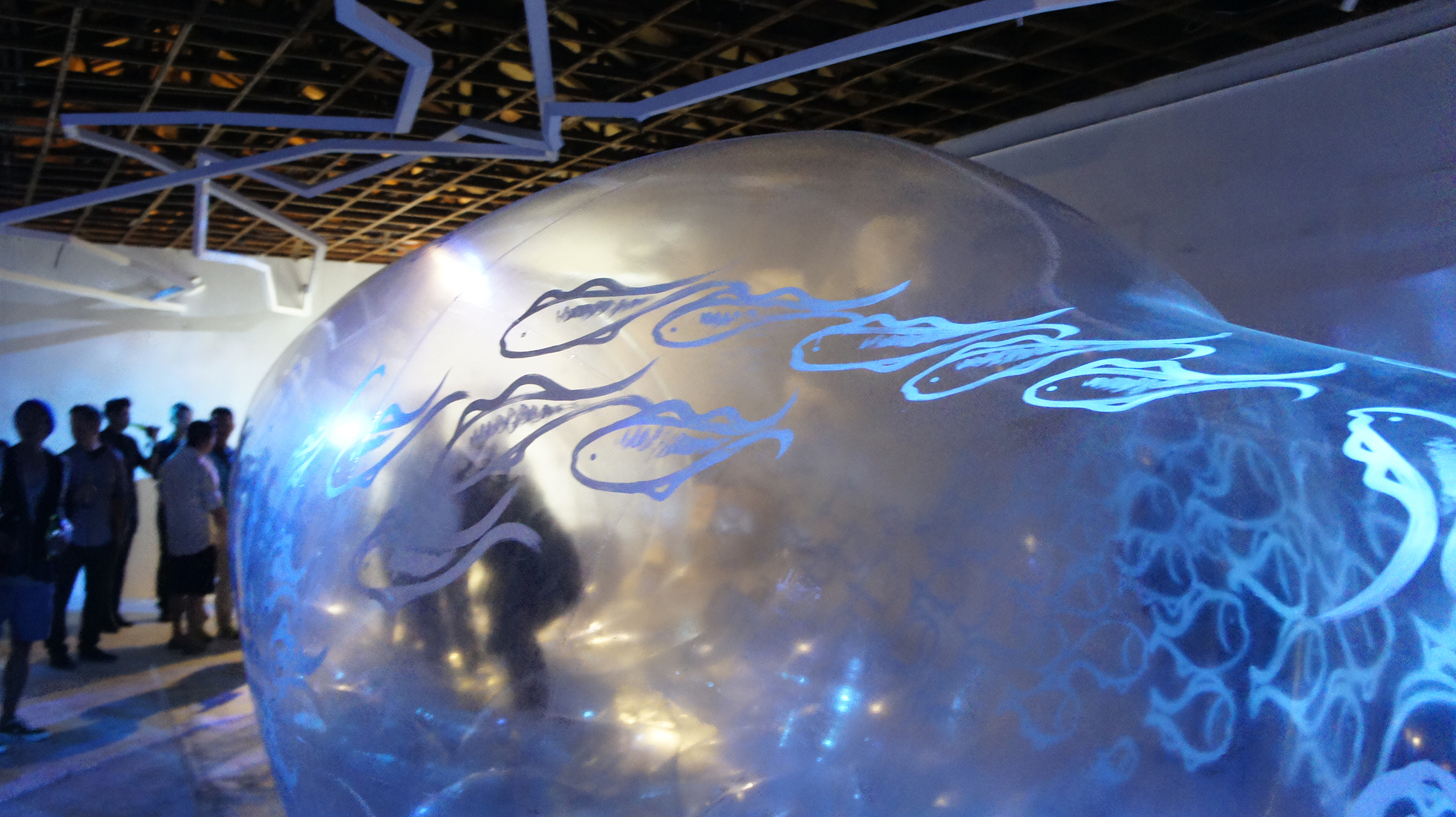 接著又走到隔壁,是蕭青陽老師的作品,是間長條型的房間,裡面有個大型的薄膜狀的東西,還有人在裡面走來走去,走到房間的盡頭才恍然大悟,那巨大的裝置竟然是個酒瓶!瓶身上畫著許多魚群,快步走過可以感受他們集體從你身旁游過,有種置身在海洋中的感覺。蕭青陽老師認為他像漂流瓶一般,在海中自由的飄泊,靠岸時隨時都會被人撿起。