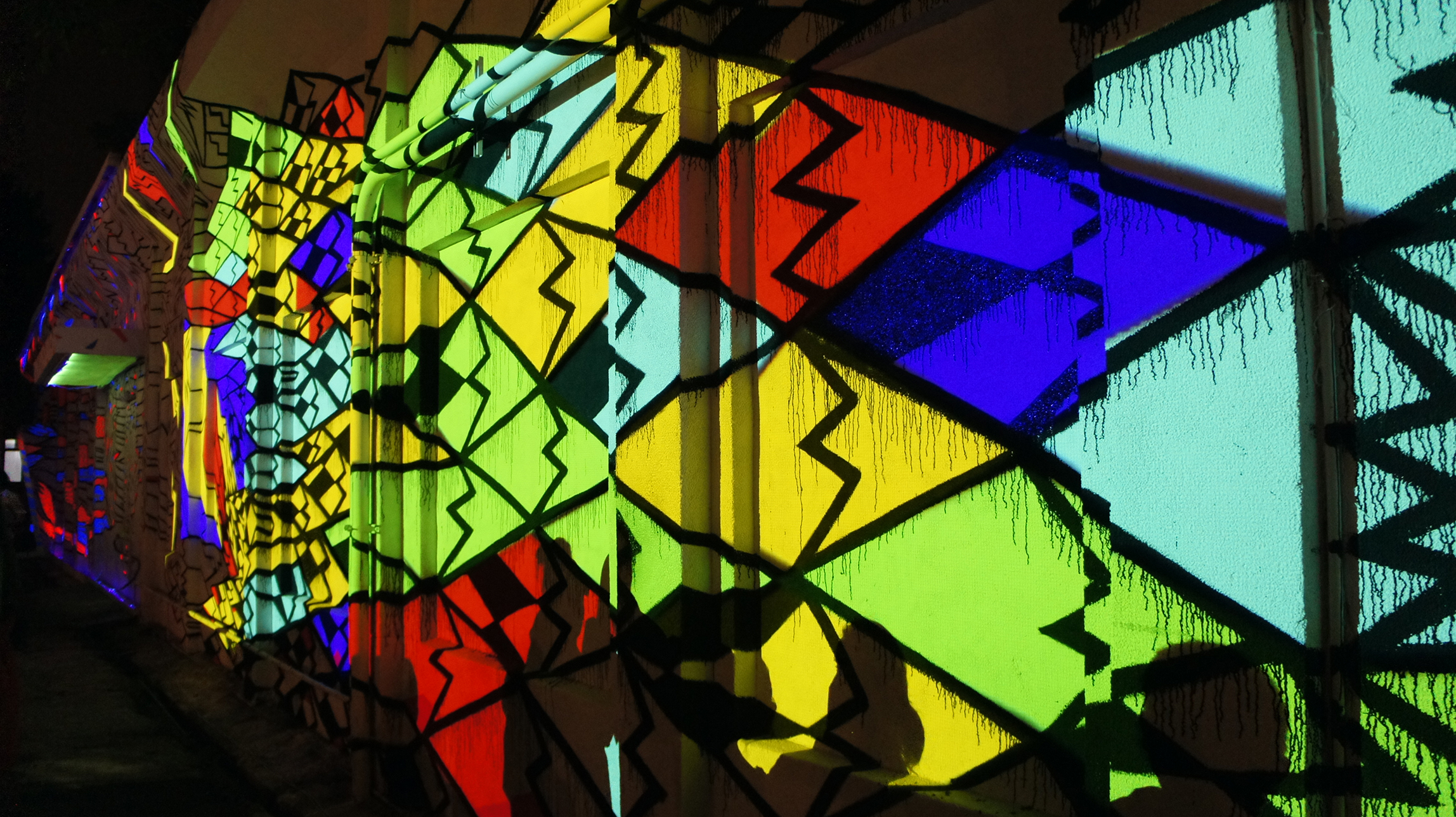 從隱密的木門進到展場,首先迎面的是 Reach 龐大的塗鴉,在每個人的身上投射了不同的色塊和線條,在每個人的衣服上做起了彩繪,作品默默的吞食了每位站在廣場的民眾,把大家都融為一體,相當壯觀。