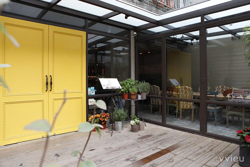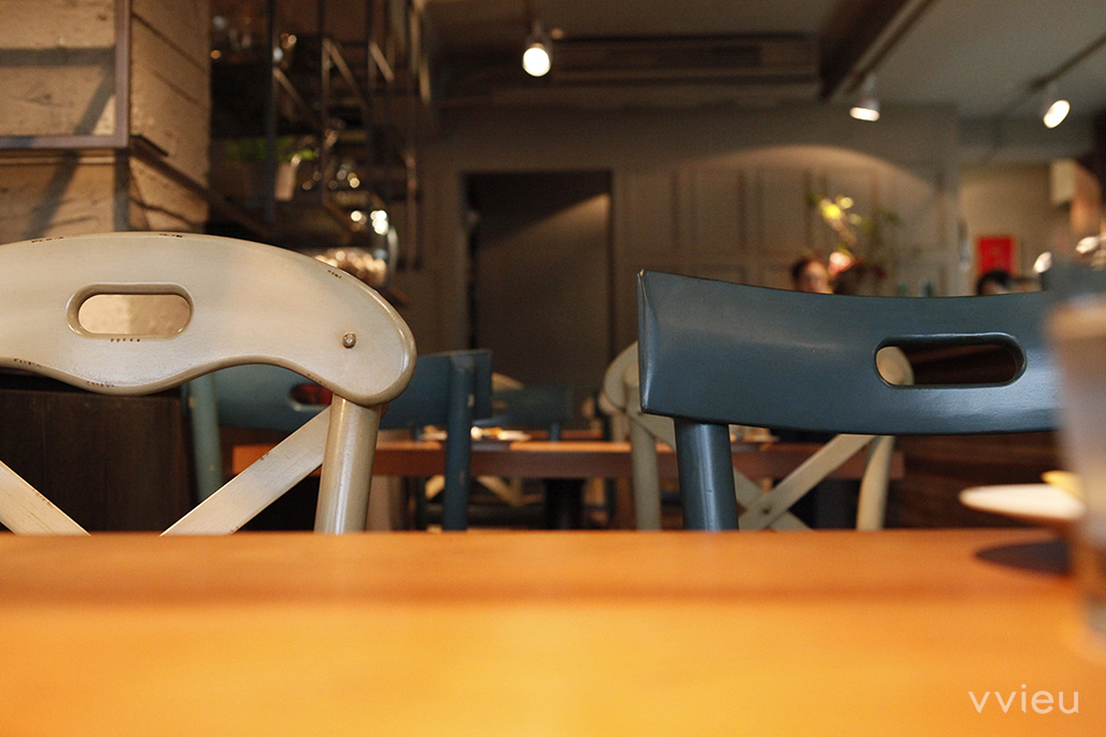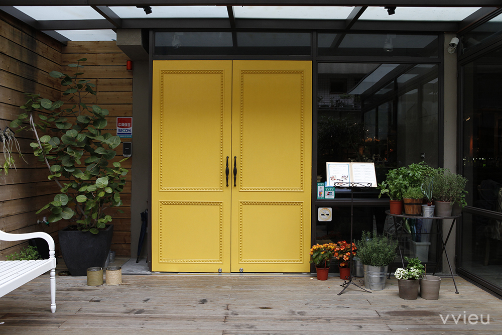 籌備初期,姐妹們找出過去曾造訪的美國各家餐廳,標出兩個人都喜歡的地方和形式,慢慢決定了空間的風格雛形。帶一點美式的郊區風味,室內有一些孔雀藍的顏色,室外的大門則是溫暖的銘黃。空間裡的紅、藍、綠、黃,都是姐妹們從小到大在美國生活時所記住的顏色;她們在復興南路的靜巷內嗅到了加州生活的悠閒氛圍,有個小小的花園,大落地窗也讓室內、外有些連結。不是刻意營造出的恬靜自在,但巷內安靜的特色總讓人一下子就放鬆下來。