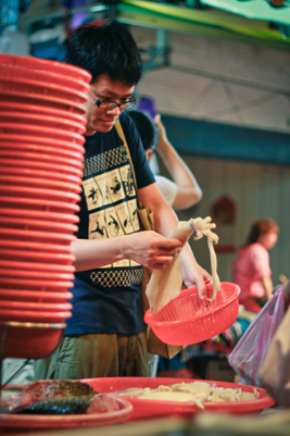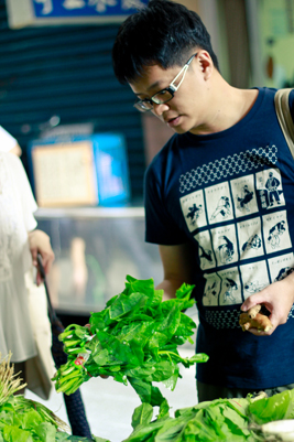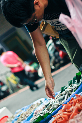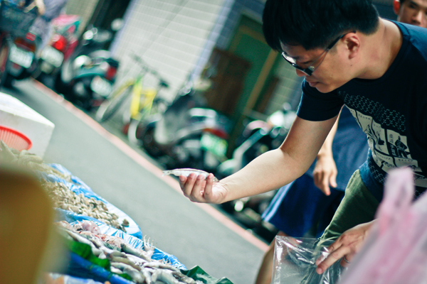 不過,為了讓大家更貼近王聰威的作家日常,我們特地在週末早上跑去土城的菜市場,跟屁蟲似地從旁偷拍了不少作家採購食材的模樣,真切地感受到王聰威確實將生活中的每一件小事,都看待得跟讀書寫作一樣認真,瞧他揀菜挑魚的態度,是不是很像在構思一篇文章呢?只不過構思的應該是晚餐的菜單吧。