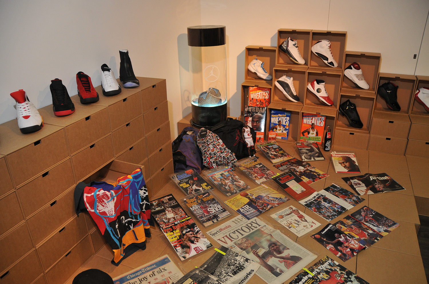 展場以鞋盒及展示鞋款,排列成 Michael Jordan 的經典海報「WINGS」,一入場便能感受到飛人的精神;現場可參觀 AIR JORDAN 各代鞋款共五十餘雙,甚至包含如印有 45 字樣的喬丹 11 代等稀有珍藏,加上如 Sport Illustrator、1984 年份的 The Sporting News、1988 年的 USA Today 等等出版品可供翻閱,以及如為 Jordan 奪冠推出的限量可樂罐等文物收藏,實有目不暇給之感!