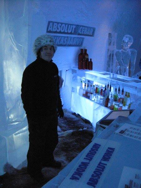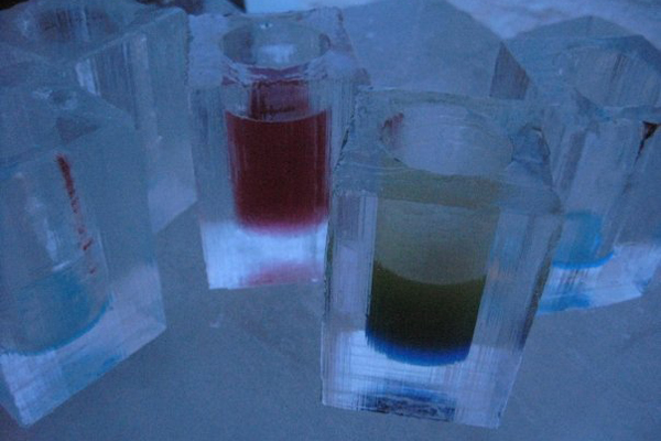 另外,因為鋪在冰床上的獸皮味道嗆得我頗不好受,因此我對 ICE HOTEL 的絕佳印象就留在了可以喝酒暢飲的 ICE BAR。其實,酒好不好喝真的是其次,用冰杯喝酒的經驗才是真正的賣點。正因為是冰杯,每人拿到時的第一反應,大概就是下意識地用舌頭舔一舔杯子,此時,慘狀就真真實實的上演了,我們的舌頭全被黏住,一排人的舌頭都黏在杯子上動彈不得。腦中模擬一下,一排人在一個類外太空超人居住的奇怪冰體建築物中,伸長了舌頭,拿著五顏六色的冰杯,卻完全不能動彈,沒有人可以喝酒,只能咿咿嗚嗚的笑,這絕對是外星人的陰謀!