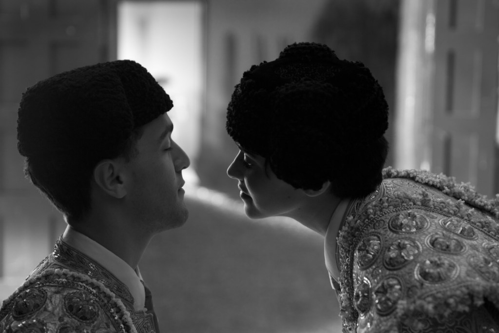 命運慘灰的卡門,遭到繼母陷害後被趕出家門,由七矮人接納進入矮人鬥牛士劇團。《卡門》一片原型無疑是西班牙著名鬥牛藝術與格林童話〈白雪公主〉之結合。黑白映像與脫離現實的場景,彷彿隔開童話綠洲與真實人生,並扭轉奇幻電影一貫著重的超自然特效,改以電影畫面的美感來書寫童話。鬥牛作為劇本最主要的藝術憑藉,轉移童話的強烈指涉性,這樣的改造打開了新的故事空間、更賦予人物生命的重量與靈魂。而雖然童話本身形式不近現實,它的底蘊卻帶著真實的觸感。