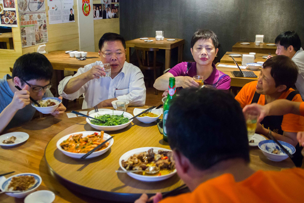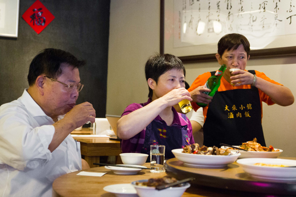 大來小館的員工們多在下午兩點左右用午餐,工作了一個上午,大家聚在圓桌前,開了瓶啤酒,隨興又家常。「我們吃飯時都要配啤酒,有時做菜實在太熱了,也會開一兩瓶來消暑!」廚師們邊爽朗地說著邊開始動筷,當天的菜色往往是隨興決定,但絕對兼顧營養均衡。