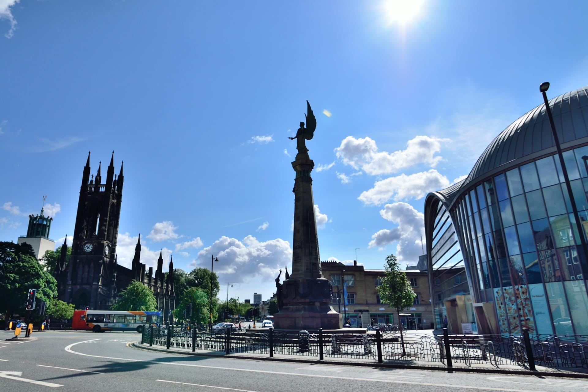 還有種天使,是上面這張照片中、及許多歐陸城市都可以看到的,這是泰恩河畔(River Tyne)和蓋咨海德對望的新堡(Newcastle,又譯紐卡索或紐卡斯爾)市中心的雕像,這般在高處守候、甚至君臨的身影,讓我想到不論《開戰時刻》或《黎明昇起》裡,都喜歡站在尖塔、高樓頂端,聆聽俯瞰著他的城市的蝙蝠俠。這樣的超級英雄形象,在新版《蜘蛛人》或神之子《超人再起》中也都可以發現。這是以一介肉身頂住天,看守世人的使命感呢!
