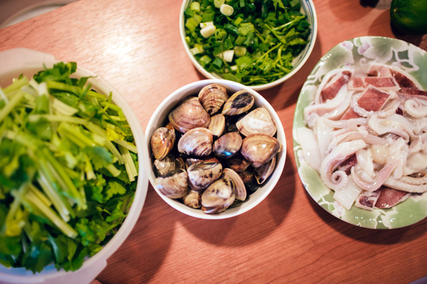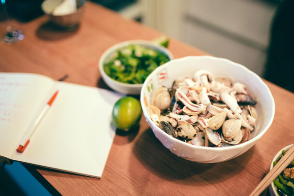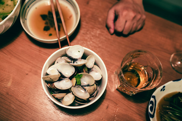 說起吃,王聰威也許並非旁徵博引的專業人士,但就如同他書寫的雜文風格,總是端給讀者、聽者最平易近人的滋味。那日下午,我們一夥人鬆散地圍著他家廚房的吧檯,飲白酒配著湯汁濃郁的奶油燴海鮮,不時夾個幾口清爽明亮的豆皮芹菜,重獲自由的小貓在旁兜轉,氣氛閒適日常,像一條淋了檸檬汁的秋刀魚。