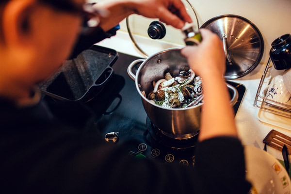 自《聯合文學》從 2013 年底開始進行改版,忙於工作的王聰威每週下廚的次數已不如以往那麼多,有時週末吃的火鍋也會不斷添加新料,吃了三日才吃完,這對於每每做菜就喜歡端出四、五道上桌的王聰威而言,著實不夠令人滿意:「因為我比較奢華浮誇一點,雖然家裡也只有兩個人,但就想要弄得看起來很豐盛。」而這樣一位喜愛窩在廚房裡舞鍋弄鏟的新好男人,談起拿手菜當然是如數家珍,向母親學來的紅燒肉、日式燉蘿蔔、令妻子讚賞的沙茶魷魚蒜,以及這天特別為我們做的下酒菜白酒奶油燴海鮮和豆皮拌芹菜,都是他的得意料理。