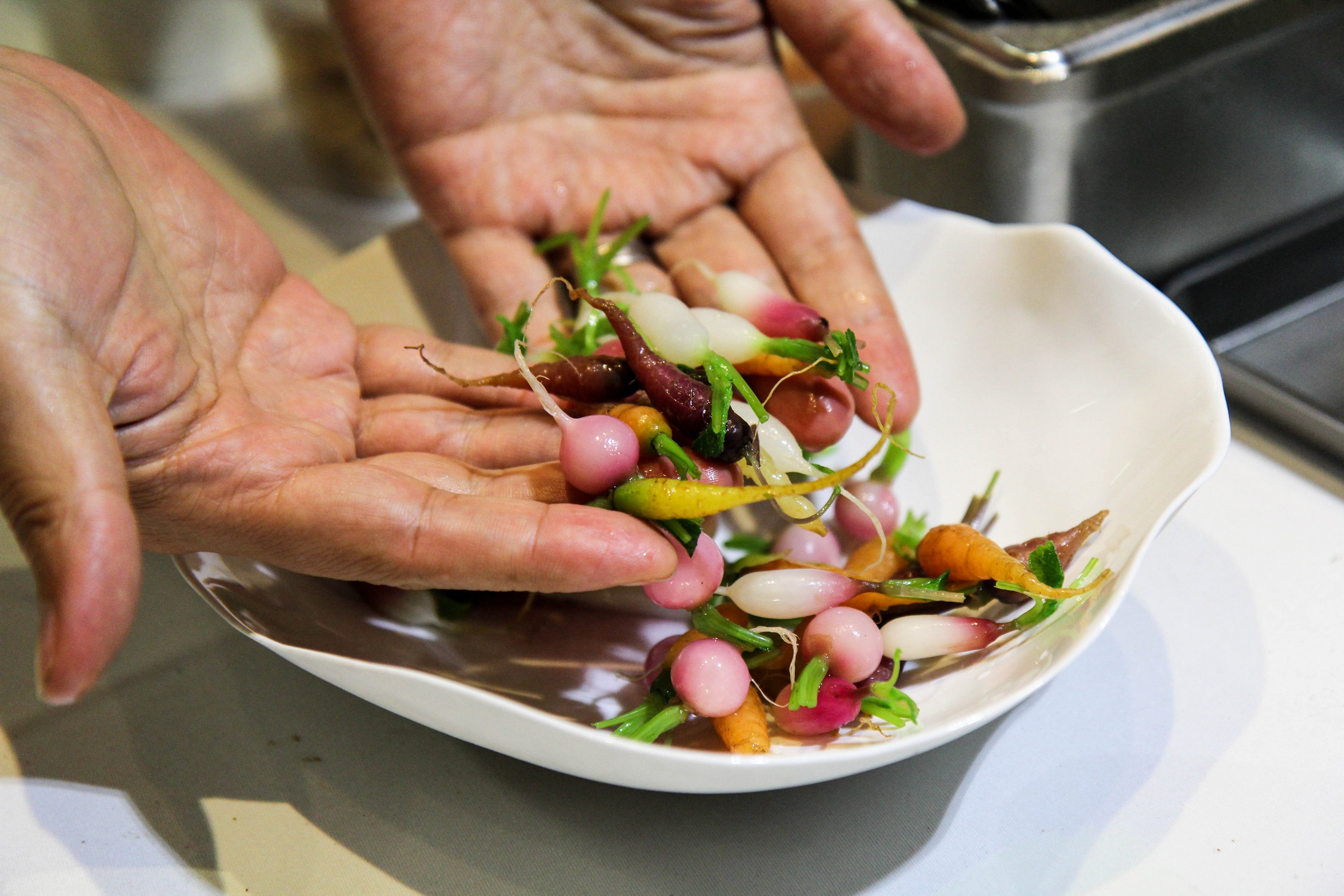 除了做菜,江振誠還進一步「種菜」。他在台灣有一個面積約二公頃的農場,生產者依照江振誠的想法種植作物,目前多為根莖類蔬菜與蔬菜的花。農場有個法文名字「Racine」,意指「根」。