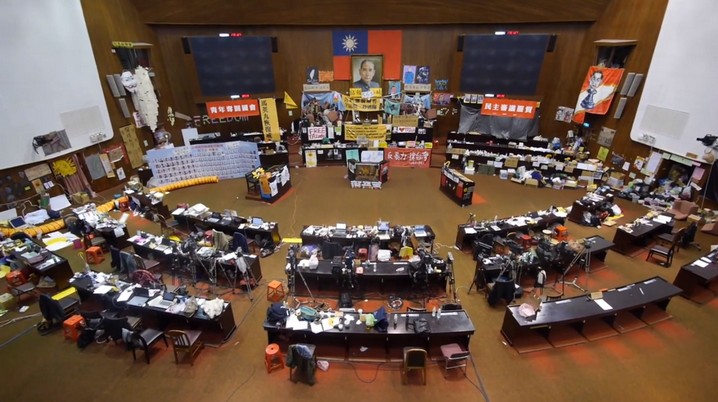 相對於《尋找木柵女》的繁複形式、以及對於台灣史和影像史之追溯,錄像藝術家袁廣鳴的《佔領第 561 個小時》(The 561th Hour of Occupation, 2014)恰成極端:形式簡潔、近乎極簡,而且關注於當下事件──佔領立法院的三一八運動;此時此刻,台灣還在它的餘波之中、甚至還在它的內部,它仍在場,運動還沒結束,它的時態乃現在進行式。此一片長僅只五分鐘的錄像作品,以單一影格、廣角鏡頭之推拉運動,俯視立法院內佔領第 561 小時之全景所構成。令人屏息驚嘆的,不只是近乎以錄像來進行雕塑、塑成一件紀念碑式的作品、聖像化了三一八的佔領行動,還在於在一推一拉之間,以其舊作《城市失格》的疊加壓縮手法,一種對媒材高度操作、反數位反電腦修圖、看似極簡但工序繁複至極、層層堆疊真實卻反而超現實的手法,讓立法院內的學生一瞬間消失──但這不是撤退,這是撤退前夕,旗幟、布條、標語、一切物品都還在;這暗示著某種史詩式的悲劇嗎?預先哀悼國家的鎮壓與橫掃?(攝影機模擬了推土機或坦克?)在攝影機的來回往復之間,同時併現了「不在場的在場者」以及「在場的不在場」,不但寫實地記錄了立法院內的佔領實況,同時也超越寫實主義、提出了近乎政治哲學的詰問與思索、以及高度象徵化的影音。既是紀錄片、也是錄像作品;在記錄與錄像之間,來回影像史以及當代史,再現、同時反思美學與政治。