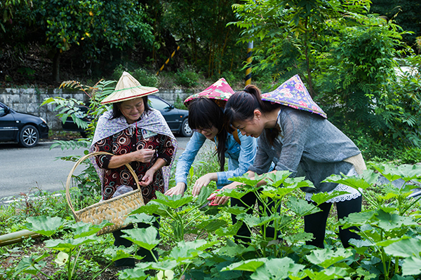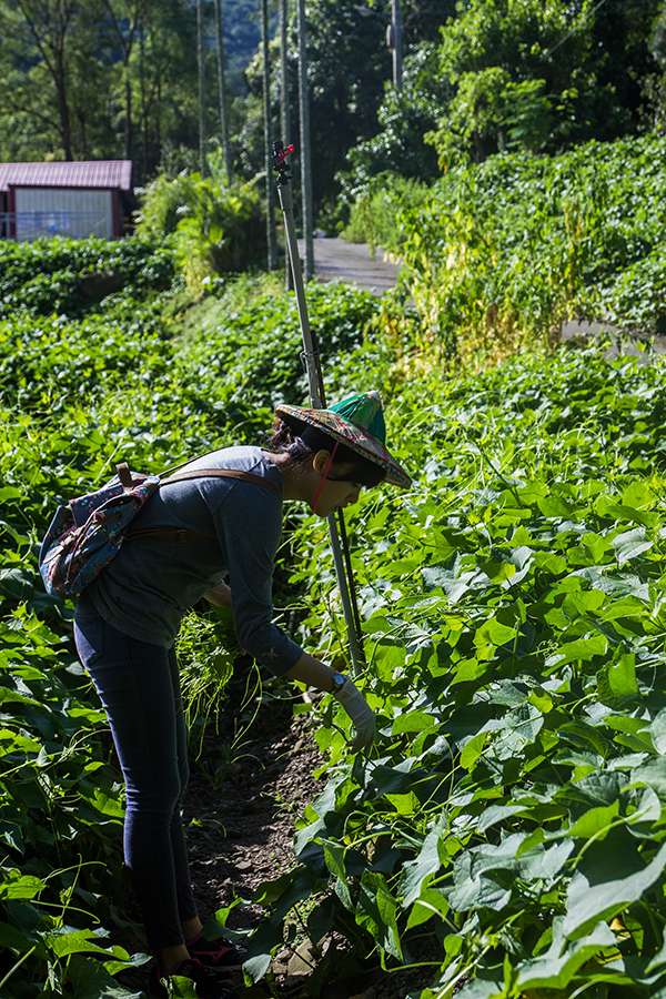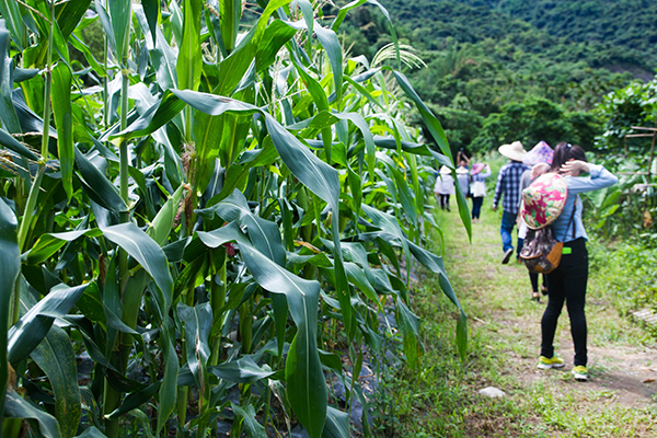 晨起,大夥乘著顛來晃去的農務車往更深的山裡去,沿途林木蓊鬱,乾淨的空氣讓陽光的色澤顯得輕盈透明,舒涼的風拂上臉,很是神清氣爽。一路上片片相連的龍鬚菜園,透露了關山社區做為全台龍鬚菜供應中心的身分。在雙臀還沒顛出瘀青前,眾人抵達了位於海拔四百公尺的龍鬚菜園,主人賴大哥親切帶領大家親自下田摘採龍鬚菜,看來簡單的工作,其實相當不容易。