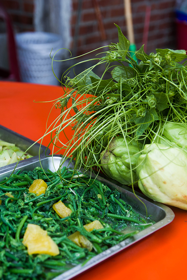 (勞動後的旅客便在古厝宅院前享用熱粥早點,龍鬚菜的果實佛手瓜入菜,清甜得人心。)