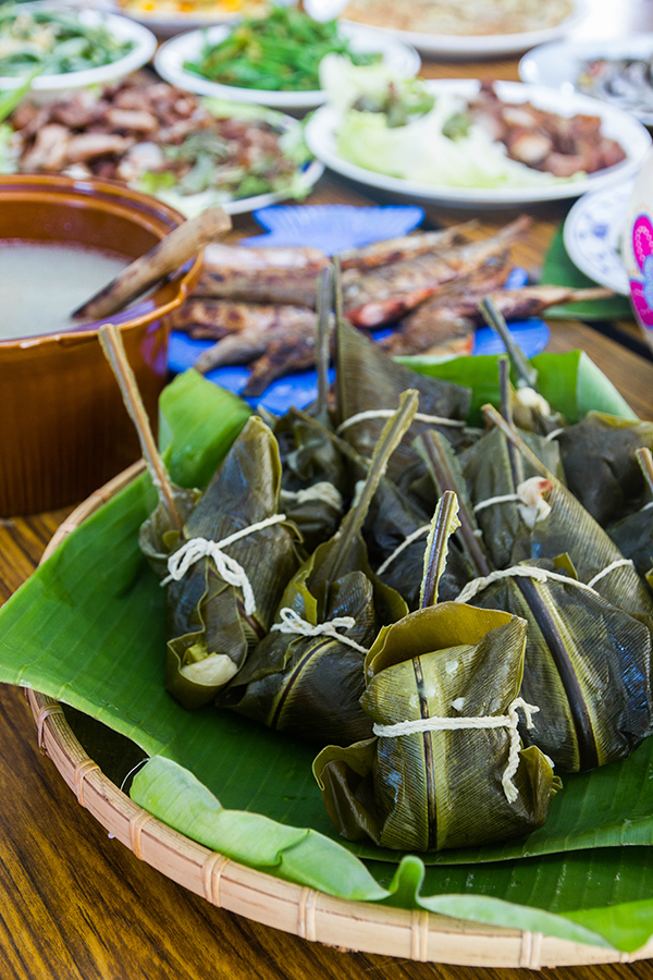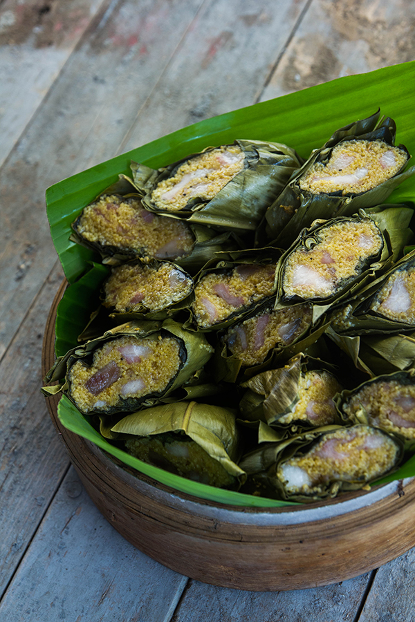 (布農族傳統米食 Savusavu 以小米或芋頭裹肉,外層以假酸漿葉包覆,口感類似漢人的肉粽;卡那卡那富的傳統食物 Umbluke,山蘇葉裹住糯米和山豬肉,富有嚼勁的糯米中含著肉香,滋味甚好。)