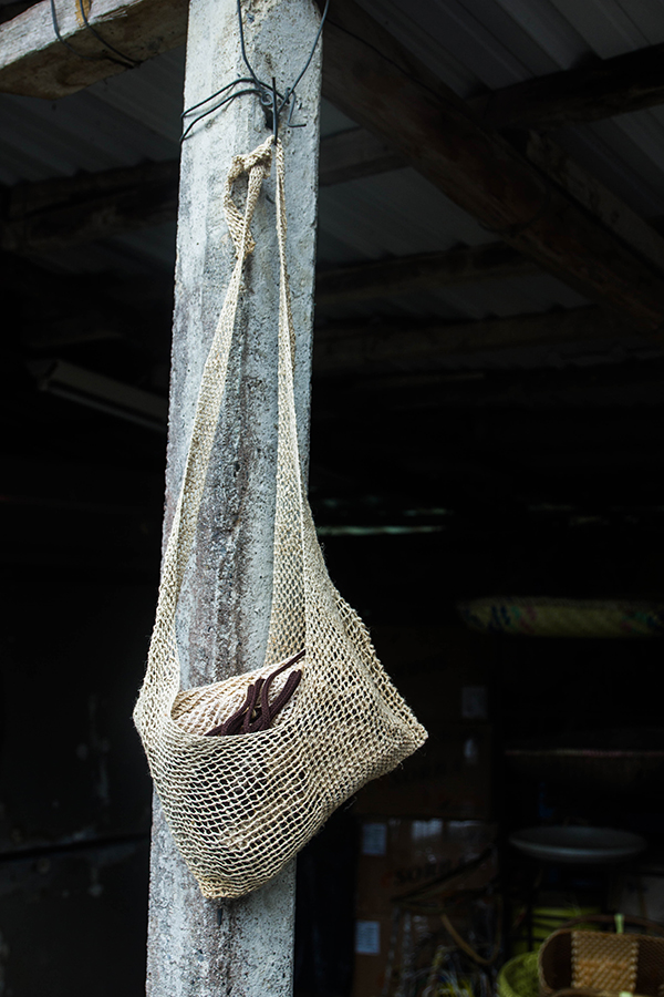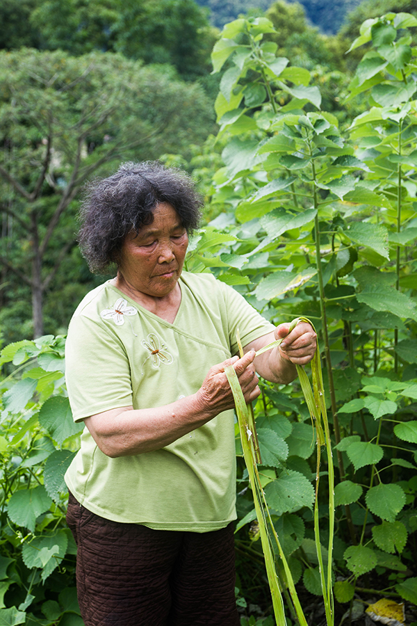 (布農阿嬤現場示範採集麻的莖葉搓成麻繩,手工織成的麻袋韌性十足。)