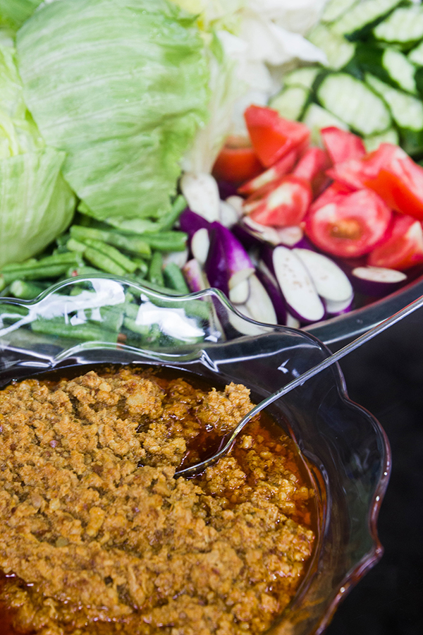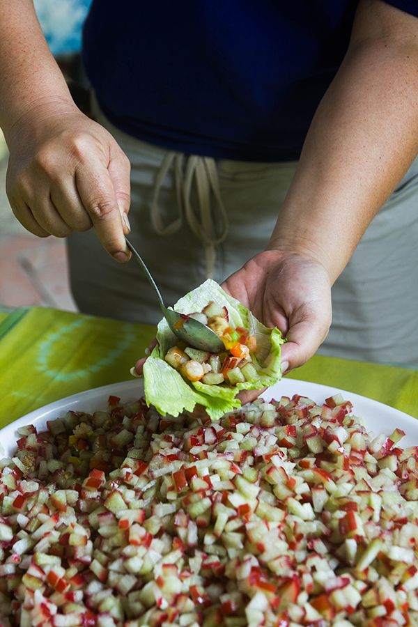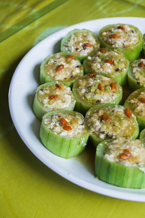 (將當地盛產的蓮霧「六龜黑鑽石」切丁,與蝦仁、核桃、甜椒拌成爽口的蝦鬆;大灶蒸出來的絲瓜鑲豆腐,味道清淡舒服。)