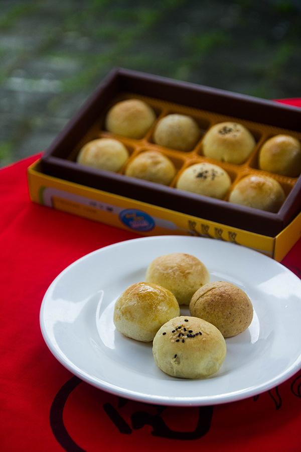 一份 8 顆的芋餅禮盒有四種口味,四間店分別推出自家的招牌:原味純芋(小奇)、胚芽麻糬(第一家)、蛋黃芋泥(三冠王)及核桃白玉(統帥),有別於市售的芋餅經常摻雜大量的白鳳豆沙以延長保存期限,或是添入香精、防腐劑等稀鬆平常的化學添加物,芋頭四兄弟的芋餅皆為百分百的芋泥餡料,不但三天內就得食用完畢,少了香精提味,甚至曾被顧客埋怨「不夠香」,著實令人莞爾。