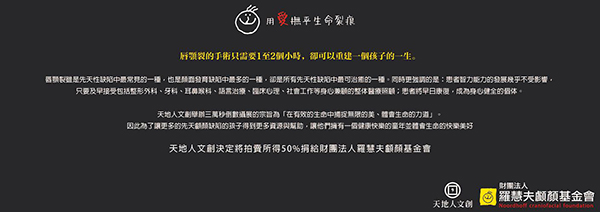 「我們希望藉由拍賣的方式,讓每件作品都有屬於他專屬的價值,並且支持攝影師,讓他們繼續追逐自己的理想;另外一半的所得則是希望能幫助到先天顱顏缺陷的孩子們,我們希望藉由這筆錢,能讓這些孩子們更迅速得到社會資源、有一個幸福美好的童年。」我們這麼期許著。