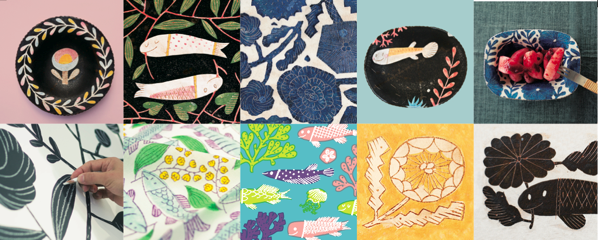 所謂「圖案」,是指裝飾性的花紋與圖樣。雖然呈現出的質感根據媒材和技法稍有不同,但常見於鹿兒島睦陶器上的圖案,像是兔子、魚、貓咪、熊、鳥以及各式花草,幾乎都是同樣構圖的花紋。鹿兒島睦透過它們,描繪了許多故事般的場景,讓人在忙碌的生活中得到療癒。