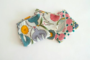 木刻版畫印刷:於印度製作的木刻版畫印刷的手帕。鹿兒島睦以本身對室內織品裝飾的製作經驗,進行設計創作。留意於織品的垂墜感。版畫是由一個個模版,以各種色彩將圖案印製呈現,是一種花費時間及心力的染色方式。由於製作上較為耗時,因此較無法大量生產。現今,除了印度之外,這種染色方式已經很少被使用。