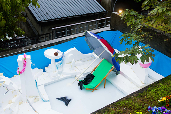 「有保麗龍、PU 發泡劑、白色的水、塑膠布,有一種殘破的浪漫。通常雕塑都會強調它的恆久性,但這些材料卻都是過渡的、暫時性的材料,這樣的素材組成一個 vacation,一個度假的場景,呈現一種反差。Vacation 的計畫也和整個寶藏巖的歷史和空間形成對比。」羅智信說道。