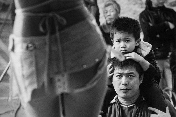 除此之外,沈昭良還運用了其它攝影的方法,譬如有一系列的照片,舞台都位於畫面的正中央,比例佔了整個畫面將近八成,場景的部分因此減少許多,頗有類型攝影的味道。另外有一組照片,則很像是傳統的黑白街拍,照片的大小不超過 10 x 12,有許多近距離特寫,譬如鋼管女郎的刺青。另外有一些照片則是很工整的肖像照。雖然背景並未特別搭建,但是那些入鏡的花車女郎都是正視鏡頭,同時打光也相當均勻,讓人想起了 August Sander 的肖像照。這些照片有如一種西方藝術攝影類型的嘗試與演練。
