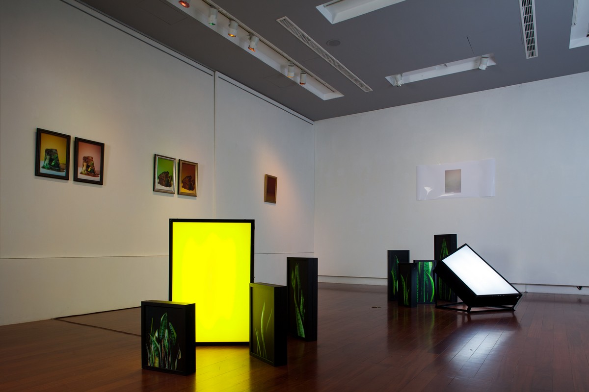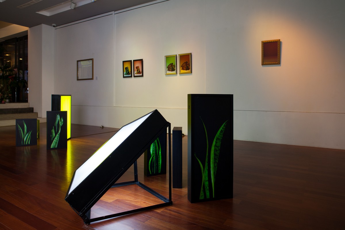 在展場中央的地板上擺放了一些虎尾蘭形象的屏風,一方面它們暗喻了中餐廳的氛圍,另一方面當他們圍繞在黃色與白色的燈箱之間,因為距離遠近的關係,而呈現了或鮮活或死板的光澤。這依然是一種中性的探問,如果刻板的文化觀點像是光,帶有各種先入為主的顏色,那麼不同事物仍會因為與此關係遠近的不同,而呈現不同的面貌。另一層意義是,這些本來俗艷的虎尾蘭,當它們脫離了原本中餐廳的場域,然後被盛放在美術館之中,它們看來就具有了一種裝置的特性,即便他們在視覺的基本調性上,是跟中餐廳之中的虎尾蘭相似(有著黃白光線的映照)。所以並不是特別的視覺手法(雖然也有手法)讓這些意象脫離的原來的樣子,而是「地」的不同,菜單系列的日光燈管也同樣予人場地的思考,吳孟真並不在喚起人們對於實際店面的經驗,也不是反過來證明藝術上的操作可以讓俗艷精緻,而讓觀者單純的凝視形式、場地與文化之間的關係,然後得到更為複雜而含混的認識。