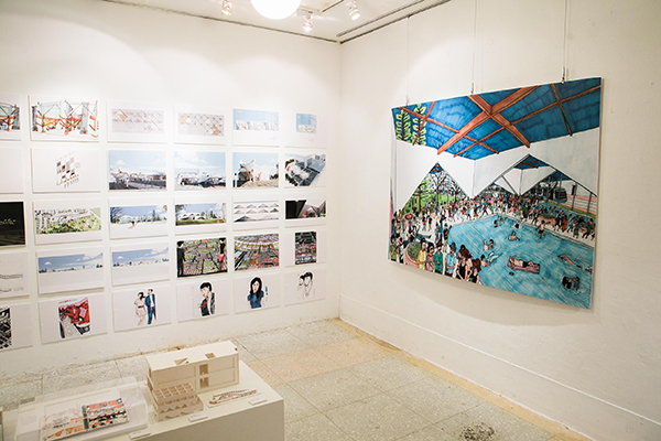 趁建築大叔還沒到,我在展場裡欣賞原畫。除了畫作,他也展出故事中的建築模型。展品中一部份是他曾參與建築競圖的作品。那些他沒機會搭造起來的房子,轉換成漫畫場景,換個形式再說一次他想告訴人們的事。
