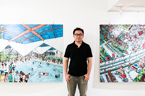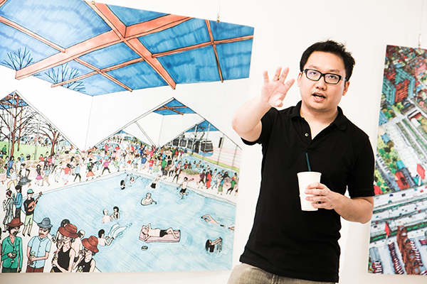 建築大叔走進地下室的展場時,手拿著一杯飲料,有點喘,冒著汗。他在澳門長大,十八歲那年到台灣來念建築,後赴瑞士取得都市設計碩士學位,再回台灣的建築師事務所就業。2014 年他尚未離開事務所工作,就完成了「TAIPEI 1/2─建築大叔的城市異想」,以中華商場和建成圓環為主題,虛實共構出另一個版本的台北。今年他離職,畫出《不用工作的城市》並以「叔大築建」之名開業接案。正在擦汗的建築大叔,三十三歲,是兩本漫畫的創作者,也是兩個孩子的爸爸。