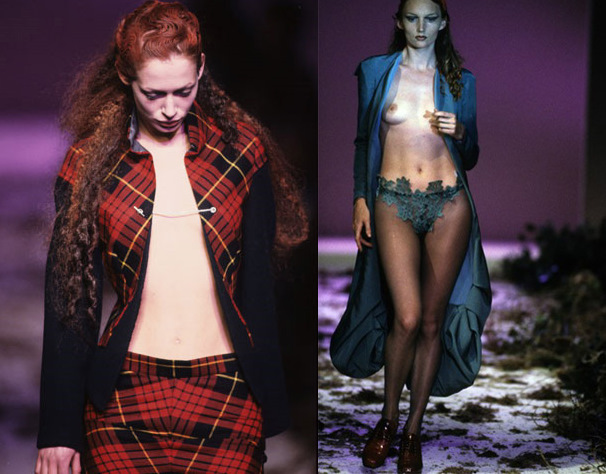那些模特兒象徵著蘇格蘭的受難者,承受不平等的壓迫和血腥戰爭。他認為,英國人在歷史上對蘇格蘭所做的事,就是抹殺所有歷史,不允許穿著蘇格蘭傳統服飾、佔領土地、取締充滿民族意識的蘇格蘭人,完全稱得上是赤裸裸地「強暴」。他摧毀了時尚界的傳統美,顛覆當時流行的極簡風潮,成功讓品牌在時尚圈內迅速拓展。後來的「克羅登女巫」(Widows of Culloden)系列,也延續蘇格蘭格紋,向 1745 年蘇格蘭起義、克羅登村中戰死的遺孀致敬(圖 2)。